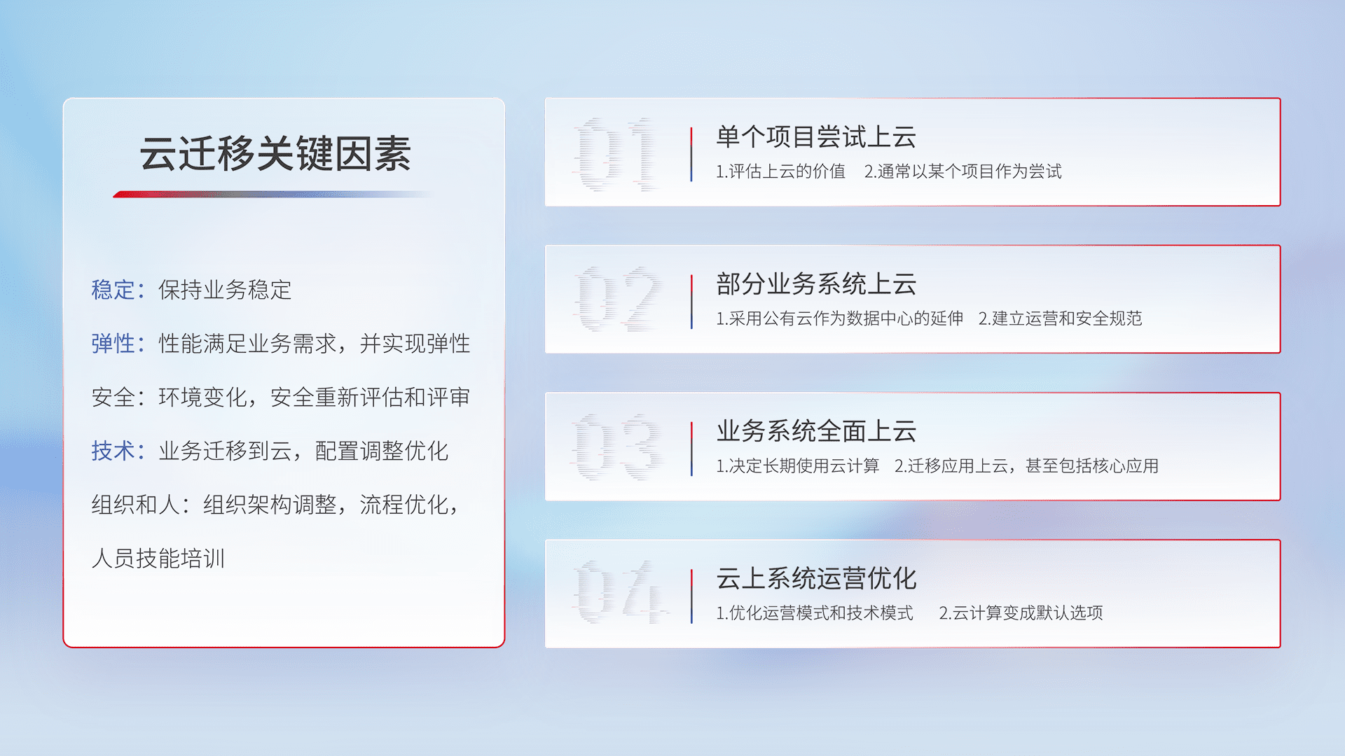 结合实际业务,,,从规划设计、、、、云平台选型、、云原生改造、、、数据迁移、、、集成交付,,迁移全过程为客户识别最佳上云路径,,,做好风险识别管理,,,设计网络架构、、身份权限、、、、安全审计合规、、操作审计、、、日志审计、、、监控告警策略、、、、多站点容灾设计等,,,,对云上基础设施进行整体规划,,,,提升IT治理水平,,以满足弹性、、、、高可用、、、高性能的需求。。