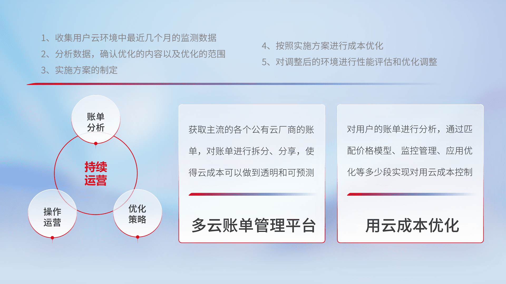 通过多云纳管,,,以统一的资源数据模型把客户的云资源进行抽象和封装,,,,进而实现对多云资源的统一操作,,,保障云资源管理的可靠性、、、、稳定性与可用性。。。量身定制化运维内容,,,配置、、、开发运维、、补丁管理、、备份、、监控、、认证和访问管理、、、审计和日常巡检等,,保障在用云过程中的可靠度,,稳定度以及高可用率。。