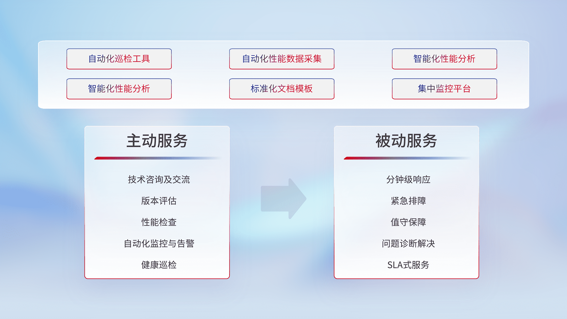 智能化工具和标准化文档,,,,保障服务质量,,,提供主动服务(包含技术咨询、、、版本评估、、、性能检查、、、、自动化监控与告警、、、、健康巡检)和被动服务包含(分钟级响应、、、紧急排障、、、值守保障、、、、问题诊断解决、、、、SLA服务)。。