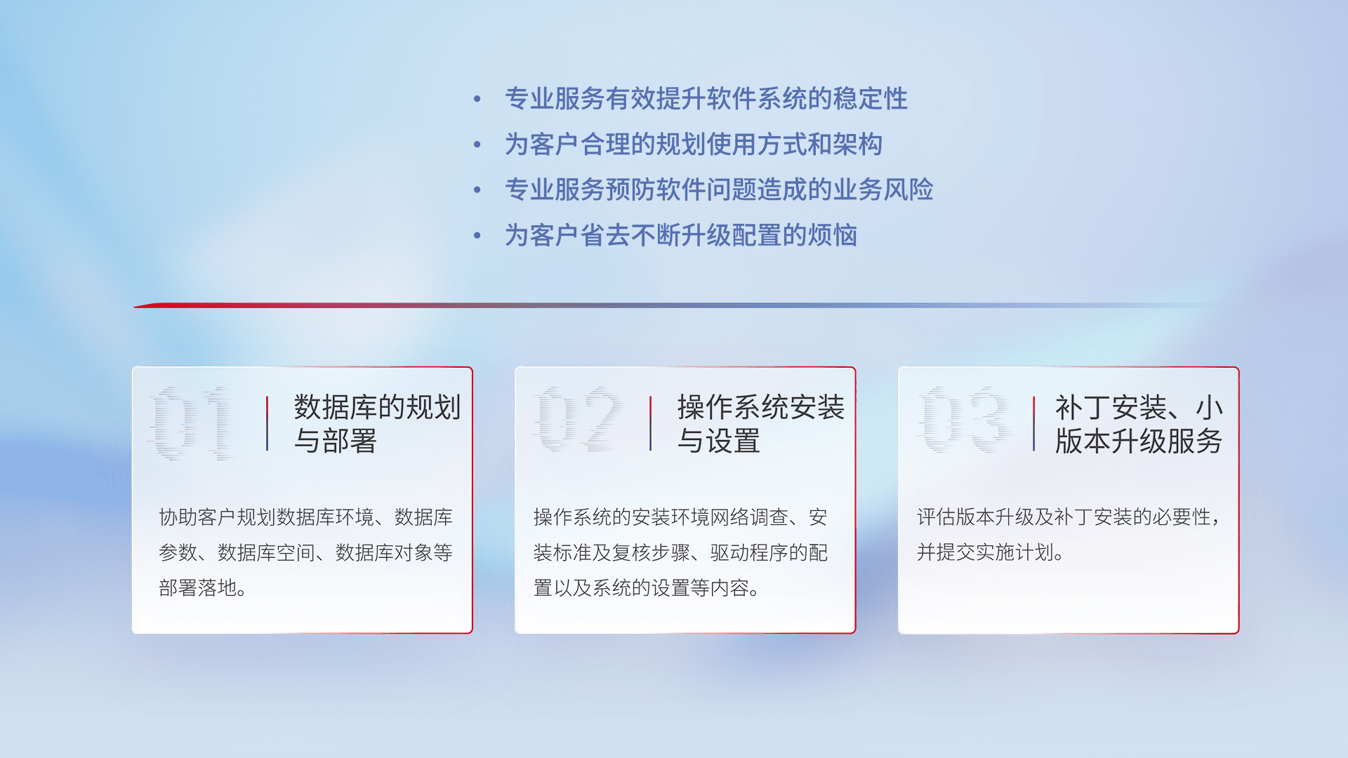 为客户提供软件规模升级、、快速部署、、按需配置的专业服务,,,,从数据库的规划与部署到操作系统的安装与设置,,,,再到补丁安装和小版本升级提供支持。。。